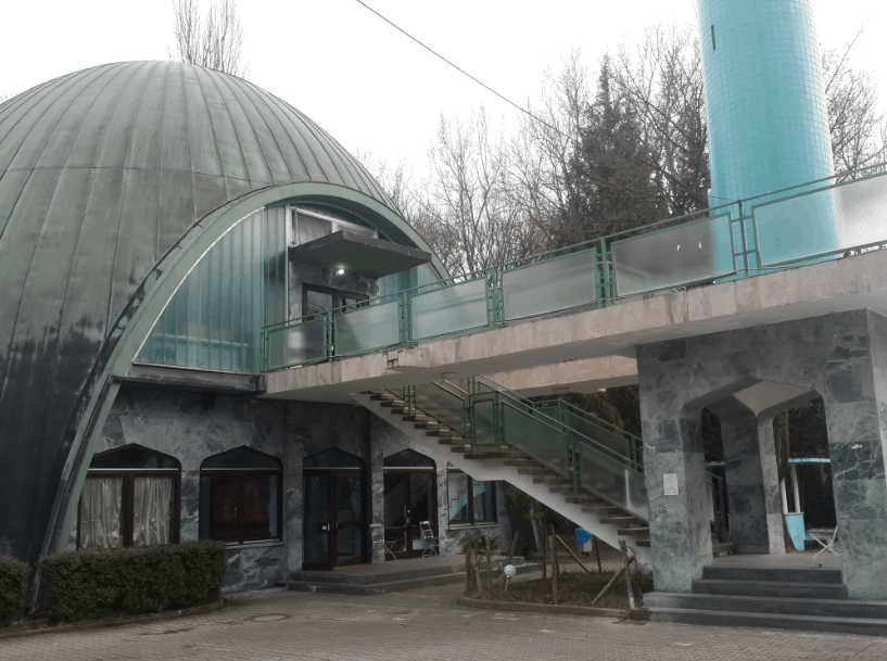 Peletakan batu fondasi pertama pada 6 Oktober 1967, kemudian masjid dibuka pada 24 Agustus 1973. Konstruksi cepat terhenti karena kurangnya dana. Pada tahun 1968, masjid dan pusat kebudayaan masih dibangun. Festival Ramadhan pertama berlangsung pada 20 November 1971 di masjid yang belum selesai. Pada 1973 akhirnya Libya menyokong kekurangan dana untuk penyelesaian pembangunan masjid. Biaya konstruksi sekitar 3 juta Deutschmarks dibiayai oleh empat belas negara Islam, dimana 1,6 juta berasal dari Libya. Perencanaan tersebut dilakukan oleh arsitek Osman Edip Gürel bersama istrinya, desainer interior Necla Gürel. Masjid ini dirancang sebagai konstruksi tempurung parabola dengan menara setinggi 33 meter yang berdiri bebas. Klien dan sponsornya adalah Komunitas Islam di Jerman, singkatnya IGD. Ruang sholat menampung 450 orang jamaah, 100 orang jamaah di antaranya di tampung pada galeri wanita.
