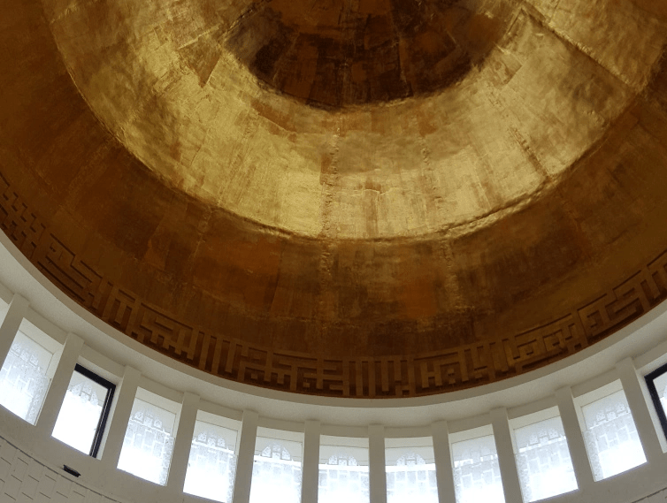 Ornamen ventilasi dari tembaga memiliki susunan berbentuk batu bata. Pada tengah mihrab muncul tulisan timbul Allah yang berwarna emas. Sedangkan mimbar terbuat dari bahan kayu yang dicat warna hitam dengan ornamen warna emas. Kubah yang dimiliki masjid ini berdiameter 8 meter denga topangan 4 pilar yang masing masing pilar memiliki diameter 75 cm. Dan dalam kubah dilapisi tembaga polos dengan kaligrafi gaya kufi.