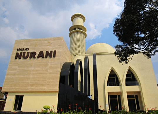 Sentuhan modern bisa dilihat dari bentuk masjid yang berbentuk kubus dengan dominasi warna cerah pada bangunan Masjid Nurani. Menara masjid yang dimiliki berada pada tengah bangunan masjid sehingga letak menara ini tidak seperti pada umumnya letak menara masjid. Menara dengan aksen banyak jendela berfungsi sebagai fentilasi udara, agar udraa didalam menjadi sejuk dan segar.